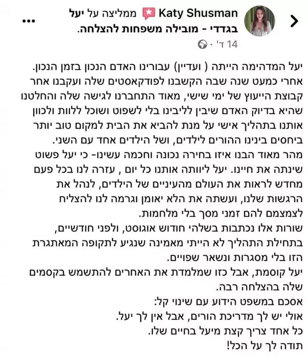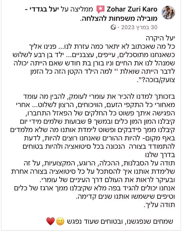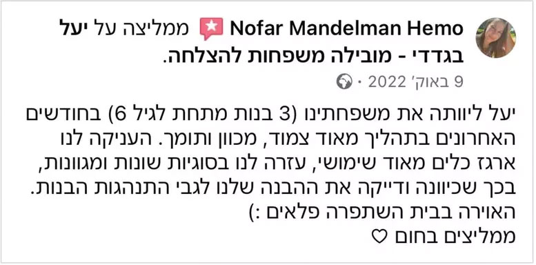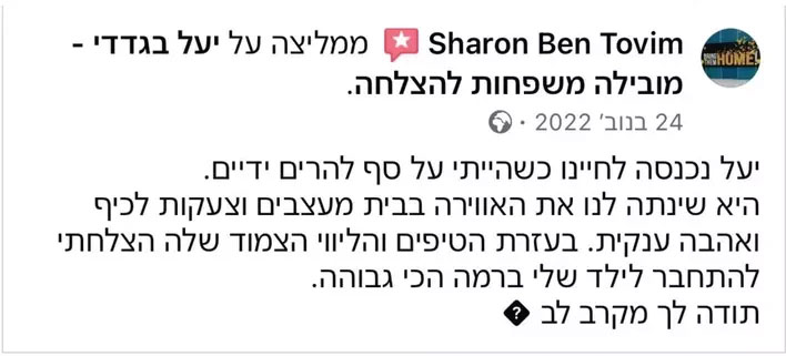 הפכתי מאמא מתוסכלת וחסרת כלים לאמא שבטוחה בהורות שלה, אמא שמבינה את בנותיה ויודעת כיצד להגיב אל מול האתגרים השונים וכתוצאה מכך הבנות שלי הפכו רגועות יותר, משתפות פעולה, מכבדות, משתפות אותי במה שעובר עליהן וכמובן שגם הזוגיות טובה יותר כשהבית הופך למקום שנעים להיות בו.