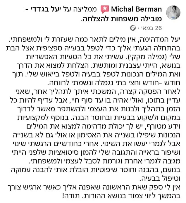 אני חיה ונושמת את עולם המשפחה על כל גווניה דרך מאות ההורים והזוגות שאני מלווה מדי שנה. מבינה היטב את האתגרים והתסכולים ויודעת להוביל בדרך קצרה וממוקדת לעבר הפתרונות שמותאמים לכל משפחה. אני מתרגשת לראות משפחות שעושות שינויים מהקטן ביותר ועד לשינויים מרחיקי לכת ומרגישה שזו זכות גדולה עבורי ללוות אותן בדרך.